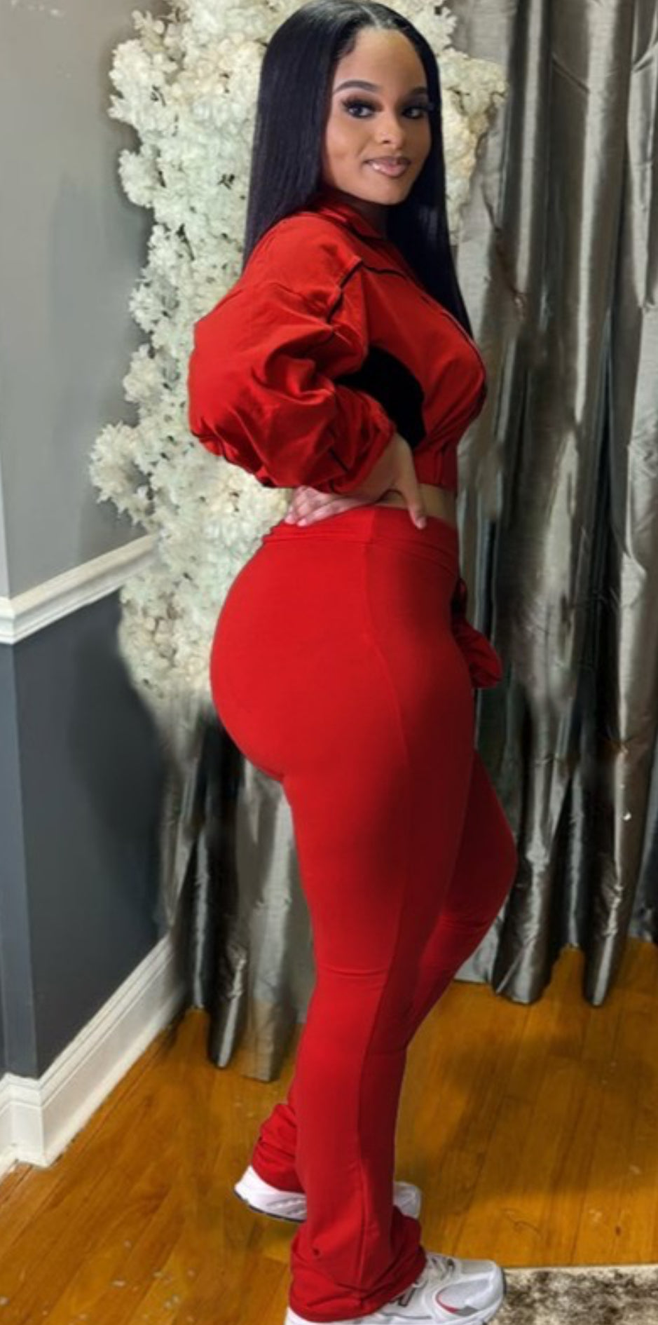 Two-tone color-block zipper top with slights flare pants, casual two-piece set