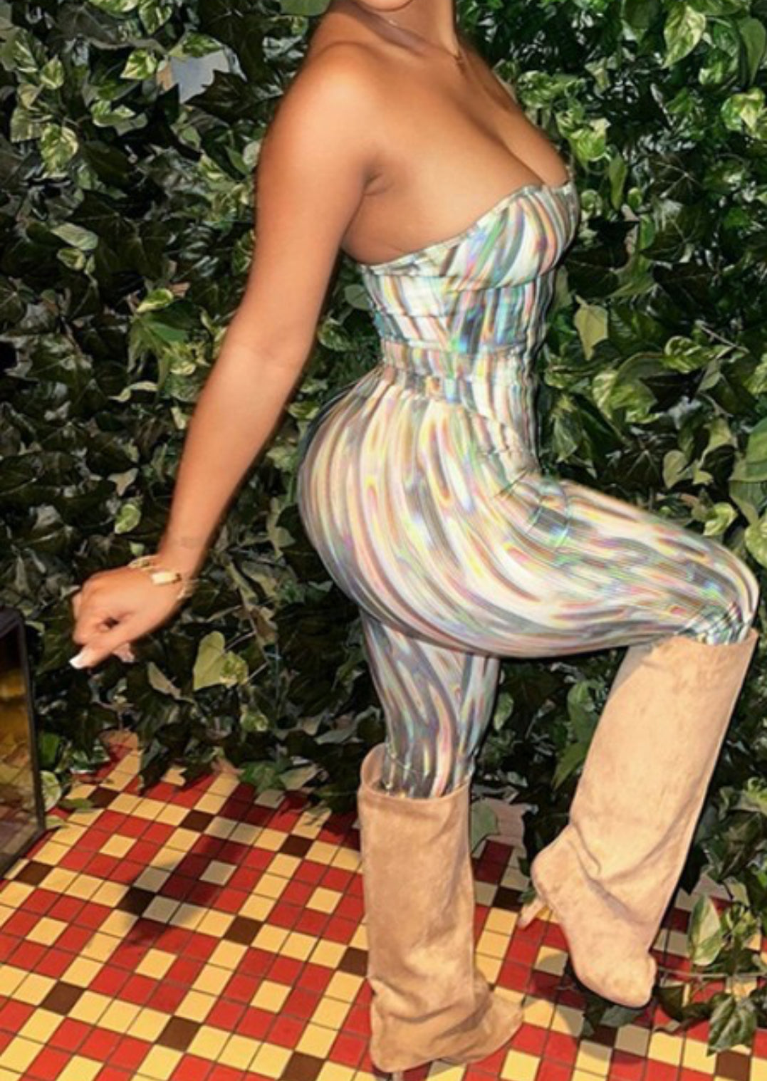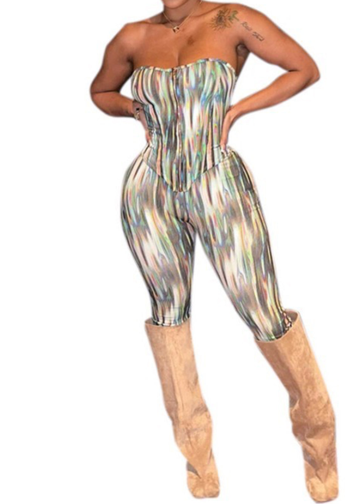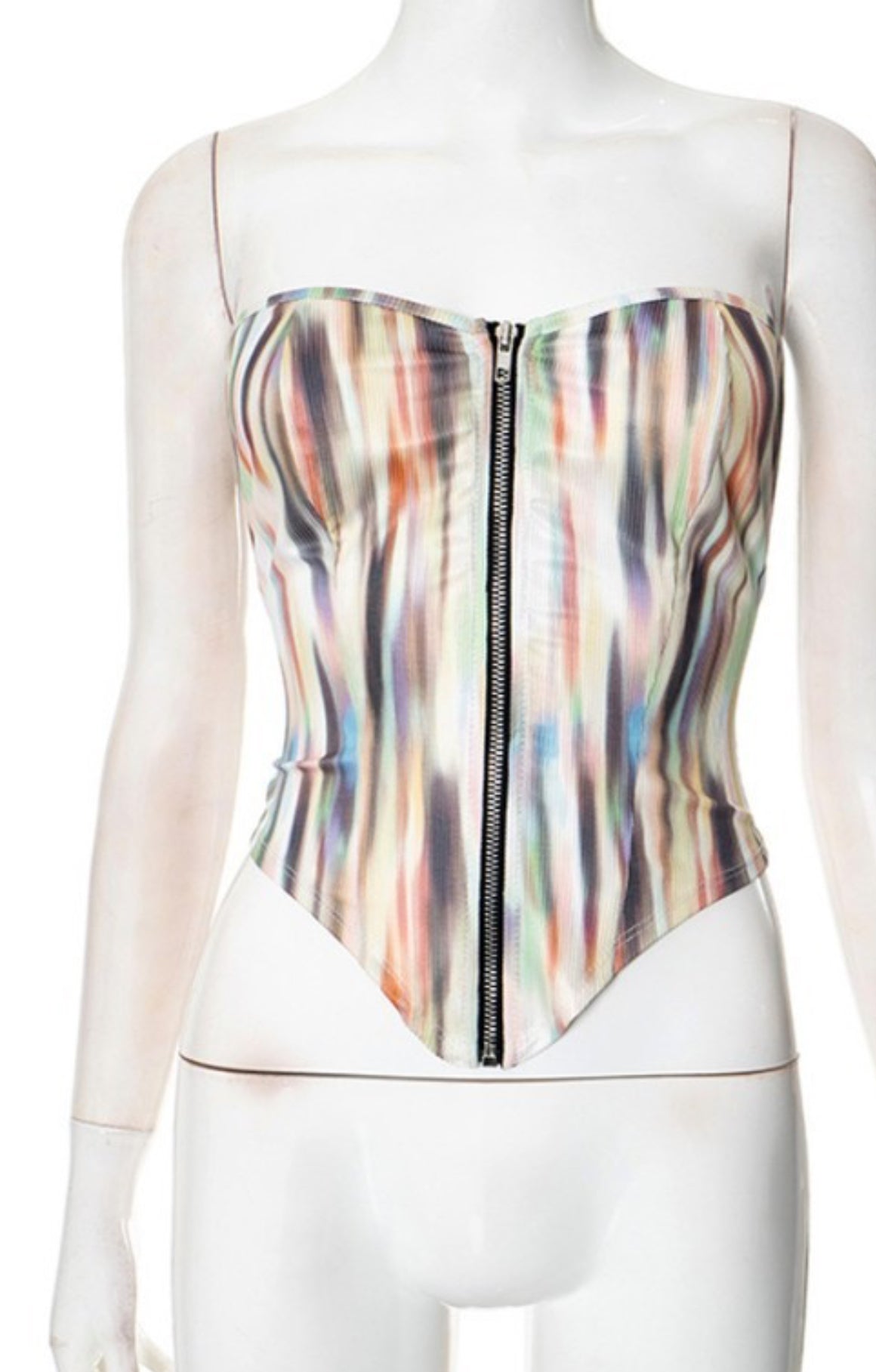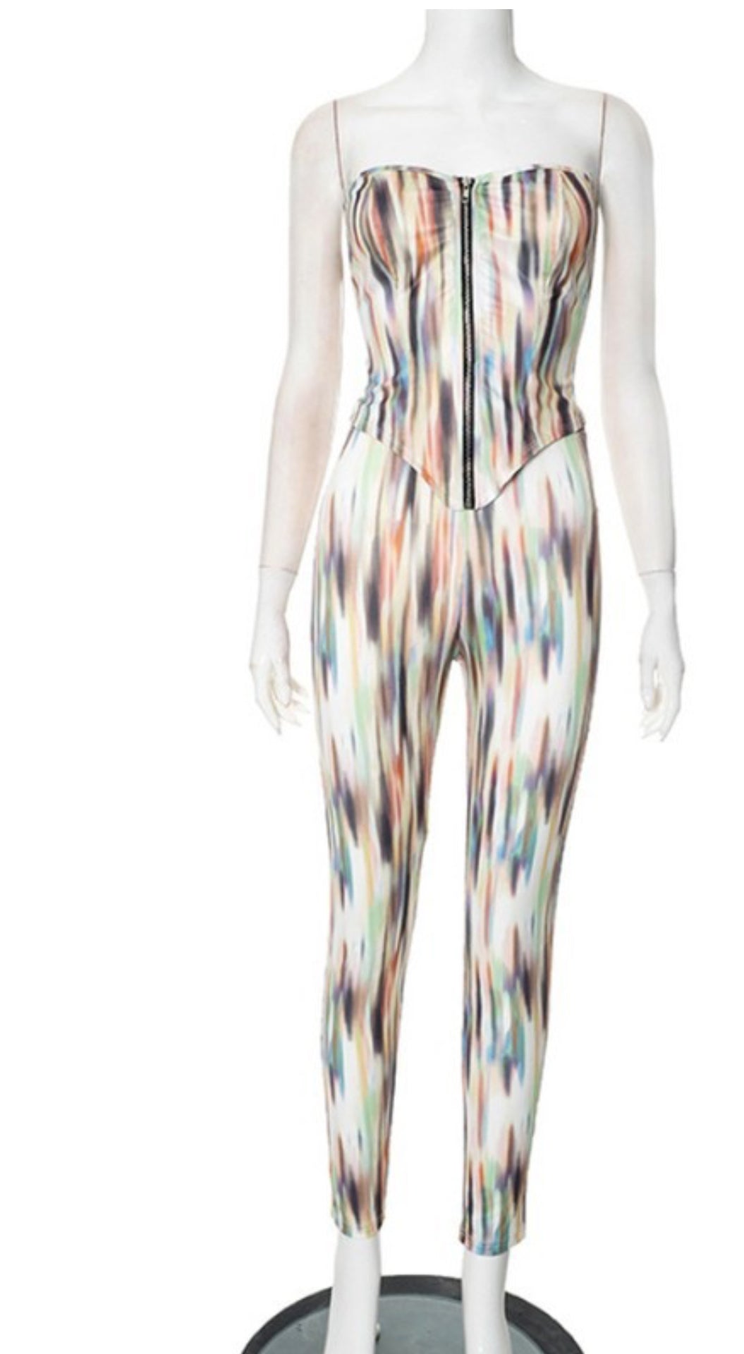 Strapless Off-Shoulder Zipper Tie-Dye Tight-Fit Elegant Set - This stylish set features a strapless off-shoulder top with a zipper and colorful tie-dye print, paired with tight-fit pants for an elegant yet casual look.