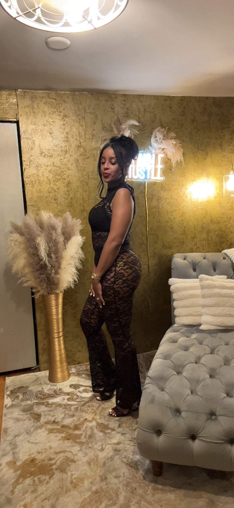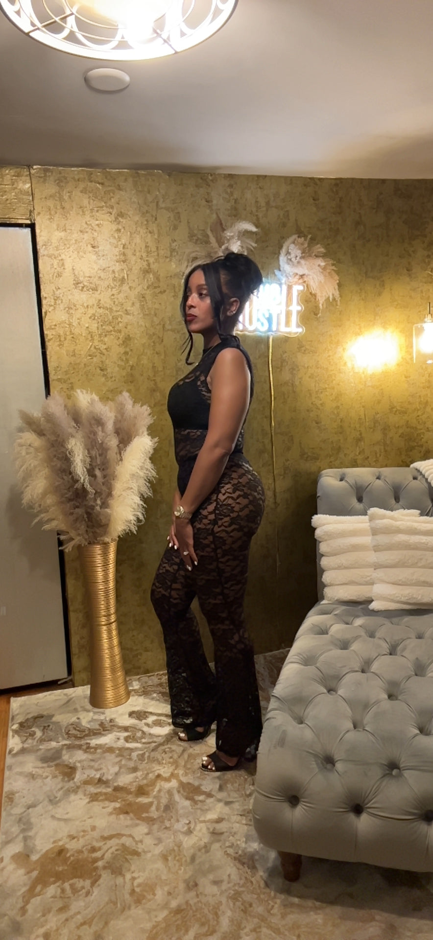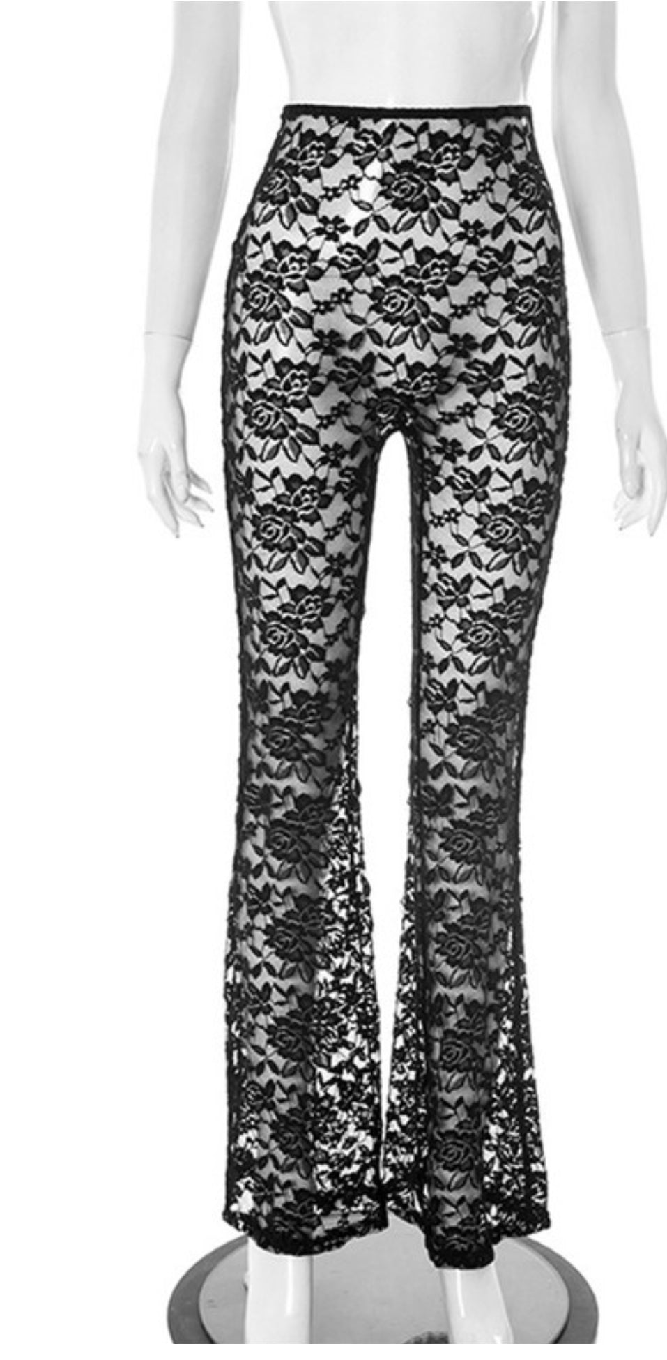 See through sleeveless lace bodysuit and straight leg pants set, sheer lace long pants. Moderate stretch